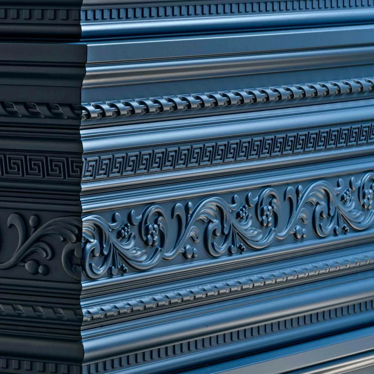 Zierleisten aus der Serie ARSTYL sind aus Polyurethan (PU) gefertigt, einem festen, hochverdichteten Polyurethanschaum. Das Material hat eine Dichte von 200 kg/m³ und ist leicht zu verarbeiten. Die ARSTYL Zierleisten zeichnen sich durch eine glatte und feste Oberfläche aus, die dank einer mattweißen Vorgrundierung Farbauftrag ohne zusätzliche Vorbehandlung ermöglicht.